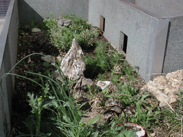 Grundsätzlich sollten Europäische Landschildkröten nur in Freilandanlagen gehalten werden und dass so großzügig und artgerecht wie möglich. Bei Haltungen auf Balkon oder Terrasse, muss unbedingt darauf geachtet werden, dass die Tiere keiner Zugluft ausgesetzt sind. Terrarienhaltungen entsprechen immer einem unnatürlichen Lebensraum und erzeugen auf Dauer ungewöhnliche Verhaltensmuster. Die Tiere härten durch die Trockene und stehende Luft nicht ab und sind meiner Meinung nach schneller anfällig für Krankheiten. Deshalb sollte sich ein Aufenthalt im Terrarium nur auf die Aufzucht, sowie Übergangszeit nach der Winterruhe bis zum Beginn der wärmeren Monate beschränken. Aber auch als Ausweichmöglichkeit bei Schlechtwetterperioden (z.B. für Jungtiere) würde ich einer Zeitbedingten Terrarienhaltung zustimmen. Ist ein Tier erkrankt, so ist es für eine schnelle Genesung, fast unverzichtbar einen Terrarienplatz bereit zustellen. Schildkröten sind von Natur aus Einzelgänger, trotzdem würde ich zu keiner Einzelhaltung raten, da sie z.B. in Gemeinschaft auf Grund von Futterneid besser fressen und allgemein aktiver sind. Allerdings vertragen sich die Männchen untereinander kaum und so kommt es oft zu heftigen Rivalitätsbelastungen. Ideal wäre deshalb eine Haltung von drei oder vier Weibchen zusammen mit einem Männchen, damit sich die Geschlechtspartner (wenn bereits adult) wechseln und nicht ständig nur ein Weibliches Tier bedrängt wird. Das Werbungsritual mit Kopulation, kann sich oft Tage lang bis zu Stunden hinziehen, was für beide Seiten erhebliche Strapazen bedeuten, so dass manche mitunter fast die Nahrungsaufnahme vergessen. Schlüpflinge sind natürlich separat zu halten und können wegen ihrer Größe nicht mit Alttieren zusammen vergesellschaftet werden.